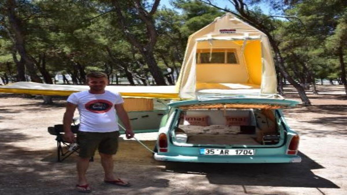 İzmir'de yaşayan ve oto elektrik ustası olan 35 yaşındaki Mehmet Ardil, çok sevdiği klasik otomobili hem çekici hem de arkasına taktığı çekme karavanda kullandı.