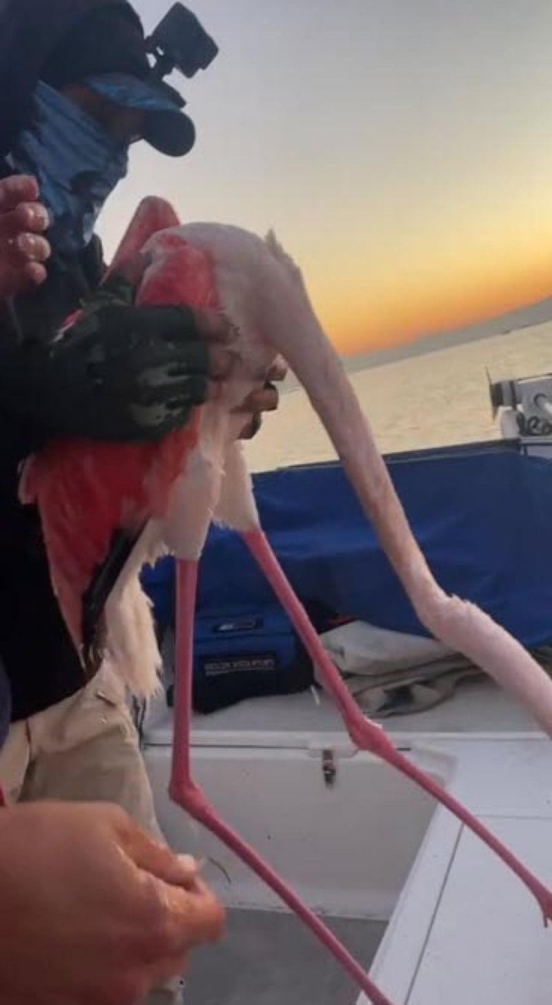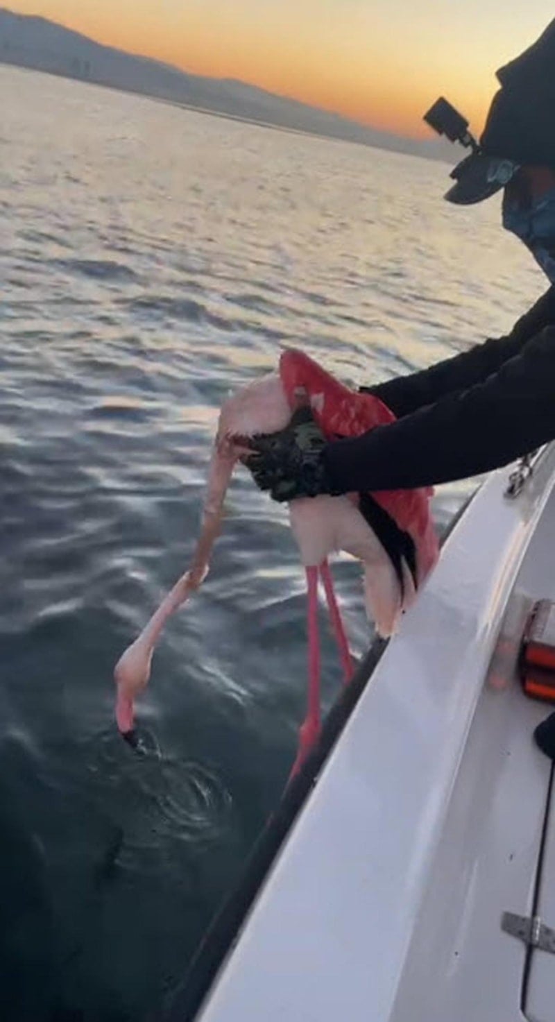 Uçamayan flamingoyu tekneye alan balıkçılar, üzerine dolanan misinadan kurtarıp, tekrar denize bıraktı.