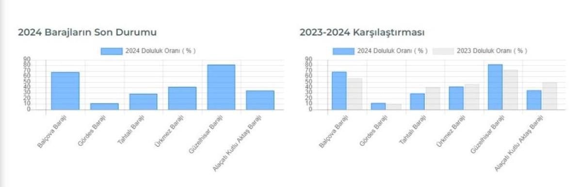 Diğer barajların ise doluluk oranları şöyle; Balçova Barajı yüzde 68,3, Gördes Barajı yüzde 11,3, Ürkmez Barajı 41,15, Güzelhisar Barajı 81,61, Alaçatı Kutlu Aktaş Barajı 34,31.