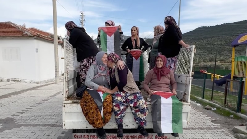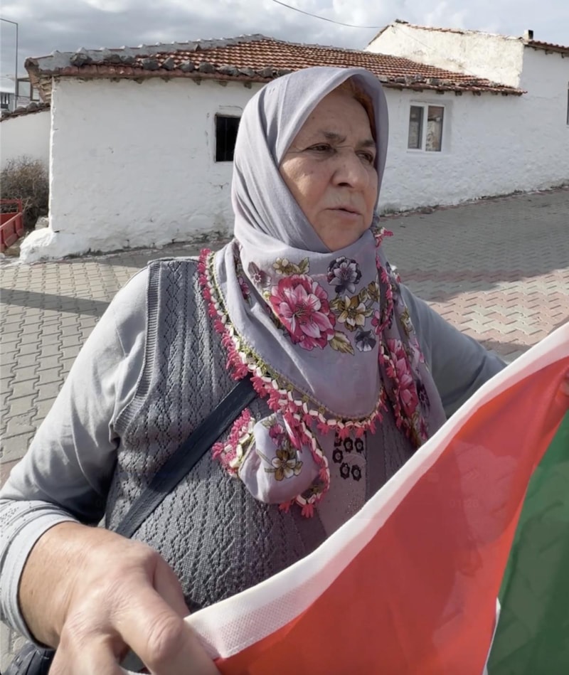"Gazze yanarken biz susarsak analığımız eksik kalır." diyerek kapı kapı dolaşan teyze, köyün kadınlarını toplayarak İzmir'e gelen Vatanım Filistin sergisine götürdü.
