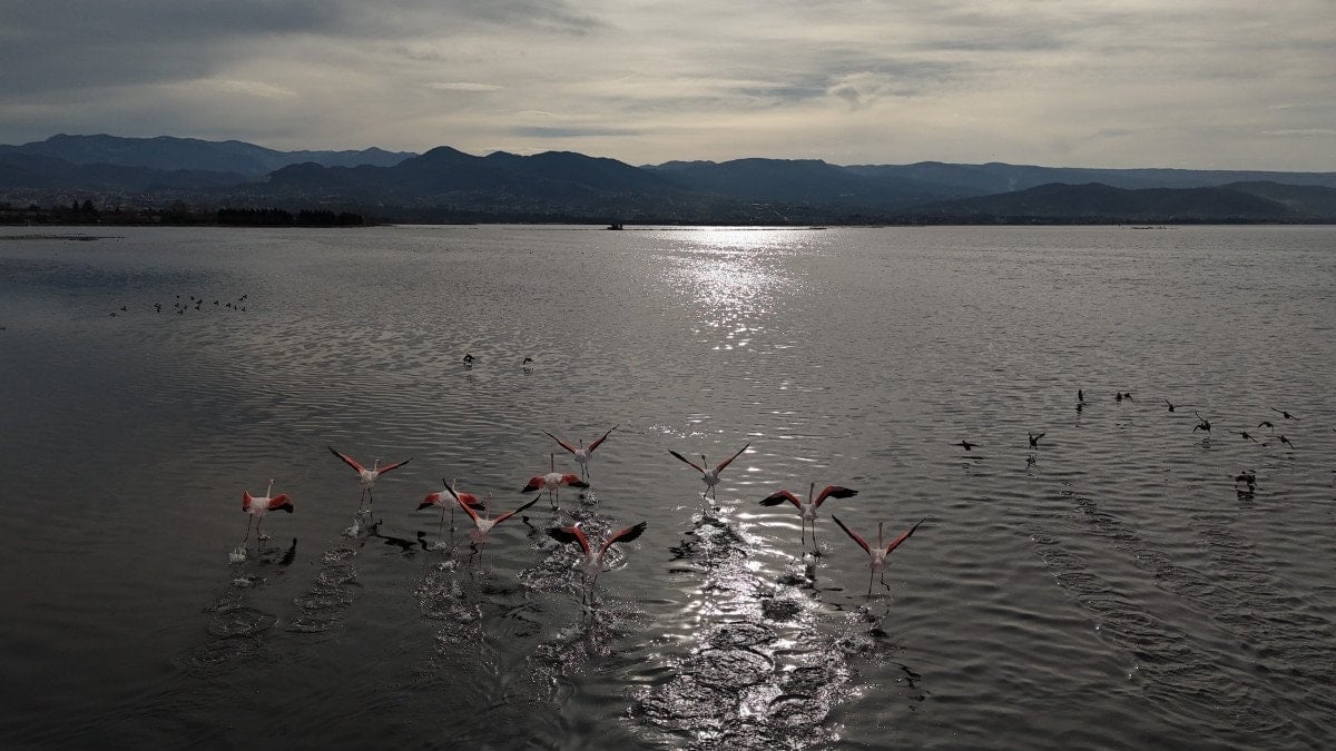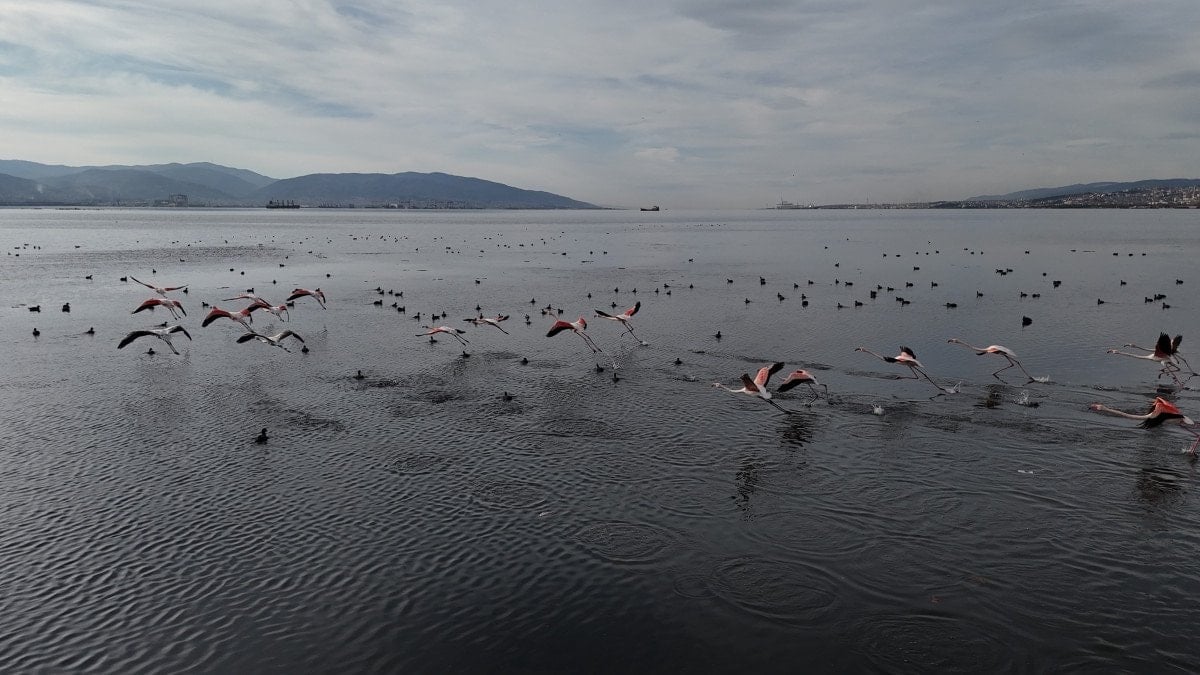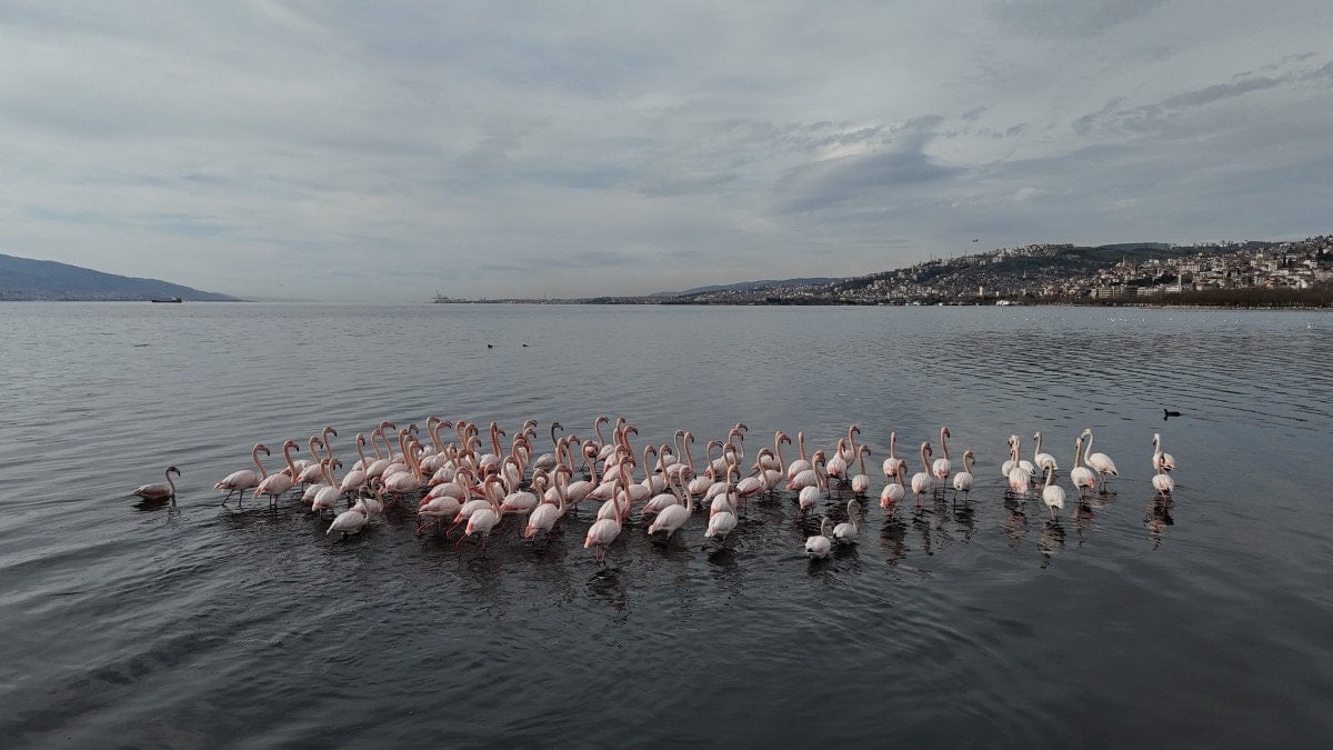 Yaklaşık 168 kuş türüne ev sahipliği yaparak Türkiye'nin önemli kuş gözlem alanlarından biri olma özelliğini sürdüren İzmit Körfezi, kış aylarına rağmen flamingoları ağırlıyor.