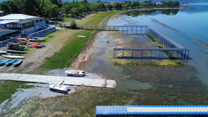 Bursa'da İznik Gölü'nde yaşanan kuraklıkta göldeki su seviyesinin düşük seviyelere düşmesi korkutucu tabloyu ortaya çıkardı. İznik Gölü'nde bulunan büyük iskele karaya oturdu.