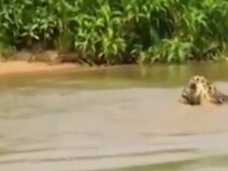 Bir jaguar, parkın suni göletinde gezinen bir timsahı gözüne kestirerek onu avlamak için suya atladı. Jaguarın, suya atlamasıyla timsahı avlaması bir oldu.