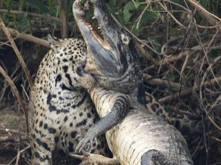 Timsahı avlamak için plan kuran ve sonrasında timsaha saldıran jaguar, yemi için oldukça fazla mücadele etti. Yarım süren savaşın ardından ise kazanan jaguar oldu.