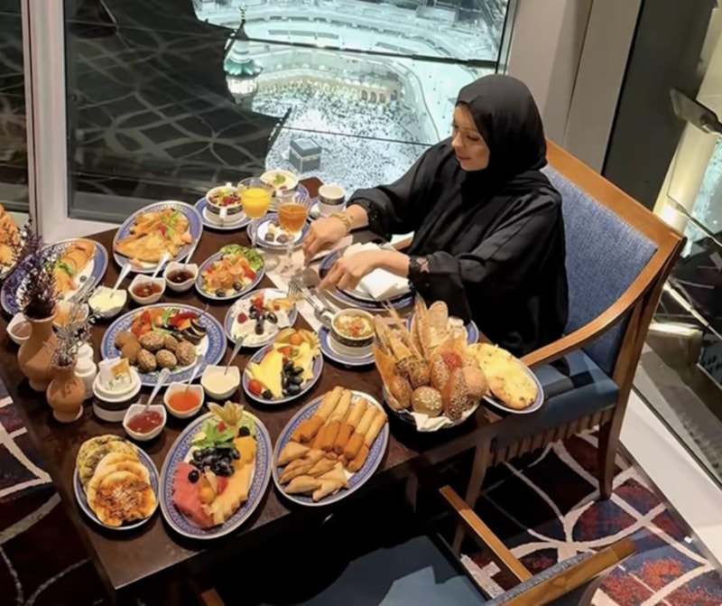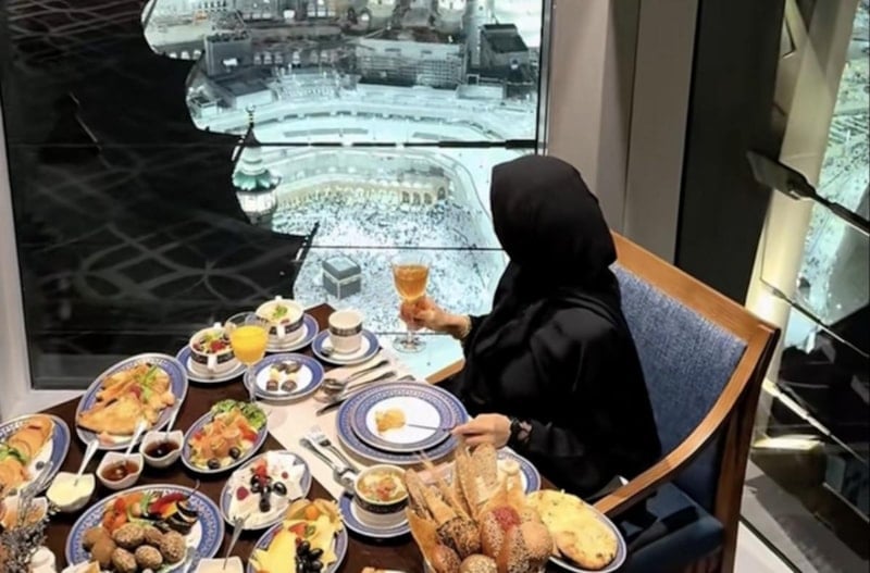 Sofrasında envai çeşit kahvaltılık ve içinde şerbet olduğu tahmin edilen kadehi ile Kabe manzarası önünden kameraya poz veren kadının paylaşımı, kısa sürede sosyal medyada yayıldı.