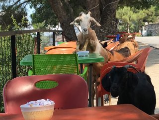 Yol kenarında otlayan sevimli keçiler yolun karşısına geçerek, kafedeki masaları yokladı.