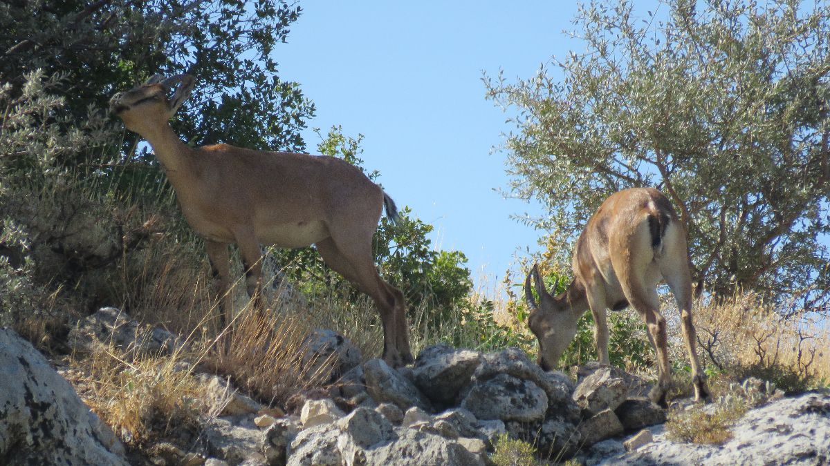 Ahır Dağı'nın güney yamaçlarında yürüyüş yapan bir grup vatandaş tarafından kaydedilen görüntülerde, geyiklerin grup halinde otladığı ve zaman zaman çevreyi dikkatle gözlemlediği fark edildi.
