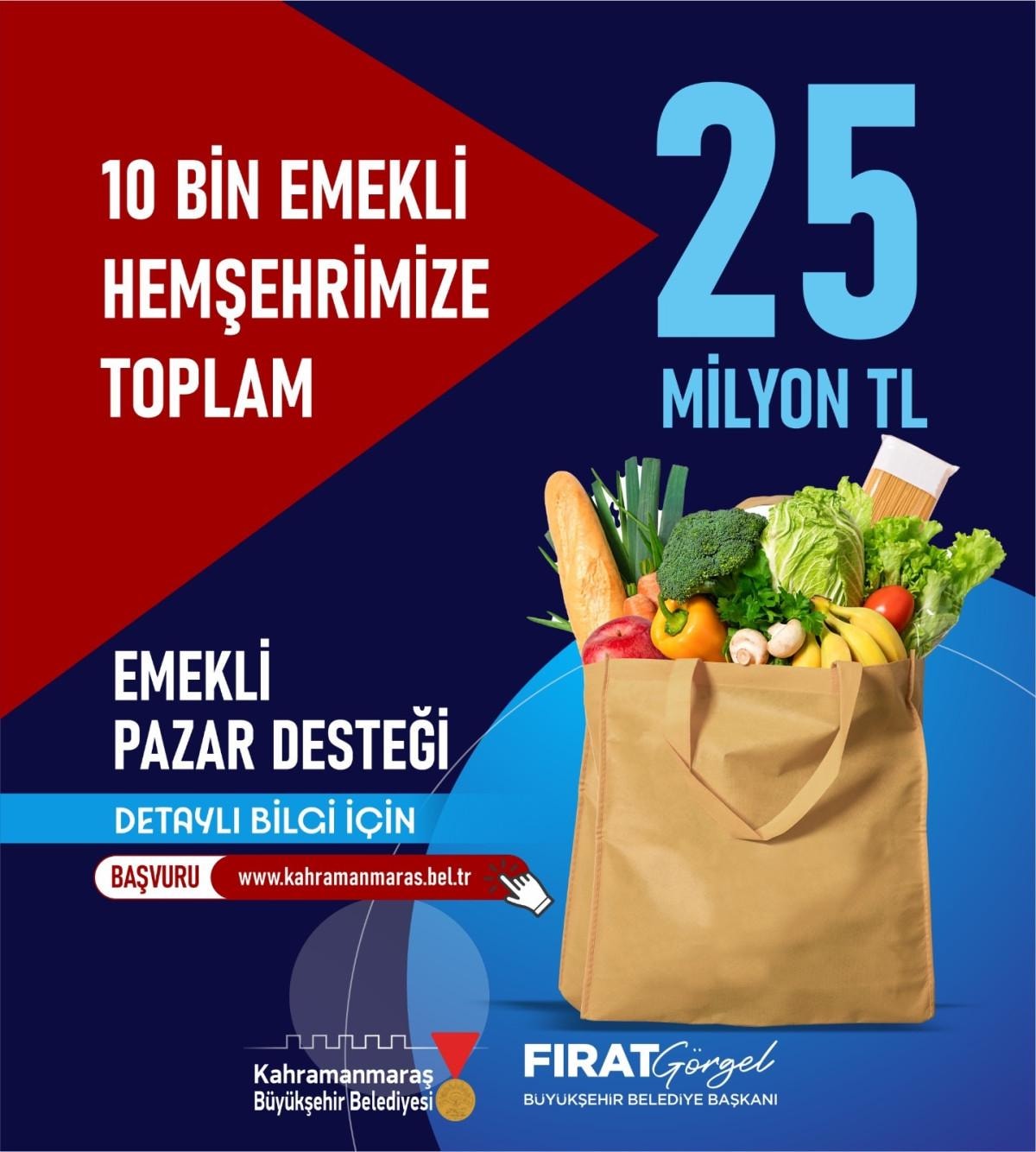 60 yaş üstü, emekli aylığından başka geliri olmayan hemşehrilerimiz için 2 bin 500 TL’lik ‘Emekli Pazar Desteği’ sağlayacağız. Toplam 25 milyon TL’lik bir destek öngörüyoruz. Başvurular Büyükşehir Belediyemizin internet adresinden çevrimiçi yapılabilecek.” cümlelerini kaydetti.