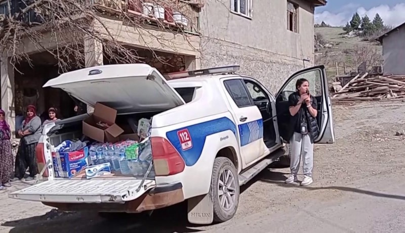 Kahramanmaraş’ta polis aracındaki anons sistemi üzerinden çocuk şarkıları söyleyen gönüllüler, aracın yanına koşan minik depremzedelere hediyeler dağıttı.