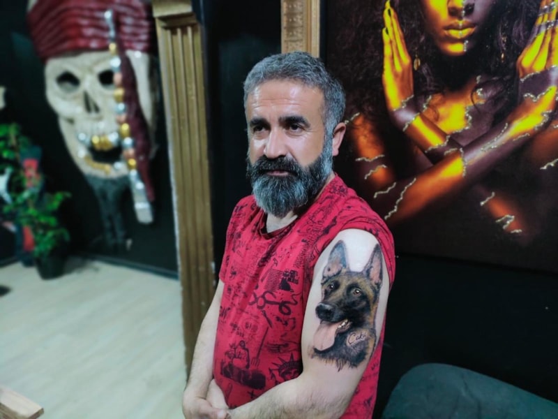 Kahramanmaraş'ta enkaz altında kalan Mehmet Çabuk, yerini tespit edip kurtarılmasını sağlayan arama kurtarma köpeği Çakıl’ın portresini ve ismini dövme ile sol koluna yaptırdı.