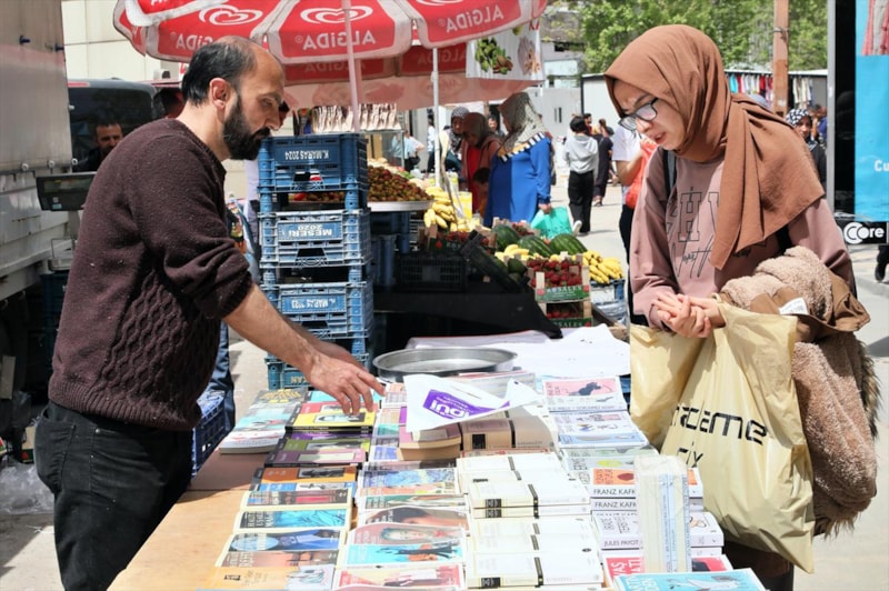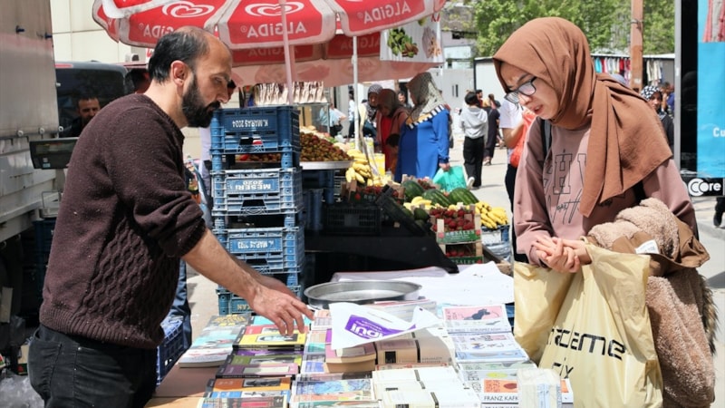 6 Şubat'ta meydana gelen depremlerin merkez üssü Kahramanmaraş'ta bir tekstil firmasında çalışan Ali Aydoğan, aynı zamanda da fuarlara katılarak kitap satıyor.