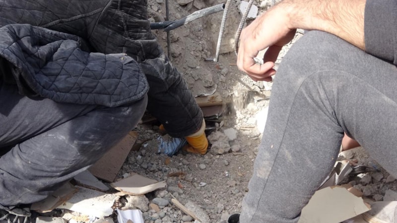 Bu bina ikinci depremde yıkıldı, gözlük ve çerçeveler enkaz altında kaldı. Biz de onları çıkarmaya çalışıyoruz, ne çıkarabilirsek artık. Gözlük camlarının çoğu kırılmış ve çizilmiş durumda. Şu an enkazın altı tamamen dereceli gözlük camı. Burası gözlük deposu olduğu için bayağı bir gözlük var. Biz buradan şehir içi ve çevre illere gözlük camı satışı yapıyorduk.