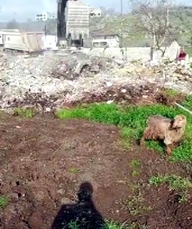 İş makinesi operatörü, enkazın üstündeki beton blokları kaldırınca keçi kendini dışarı attı.