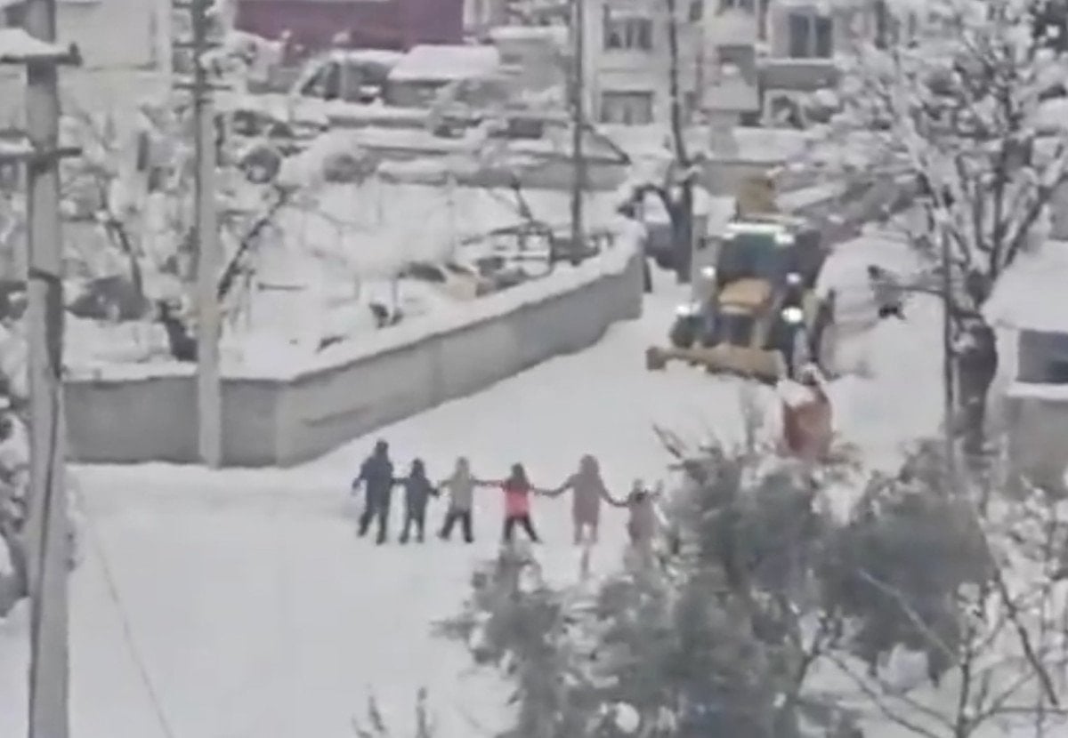 - Çocuklar, karların temizlenmesini engellemek için ele ele tutuşarak ekiplerin yolunu kesti.
