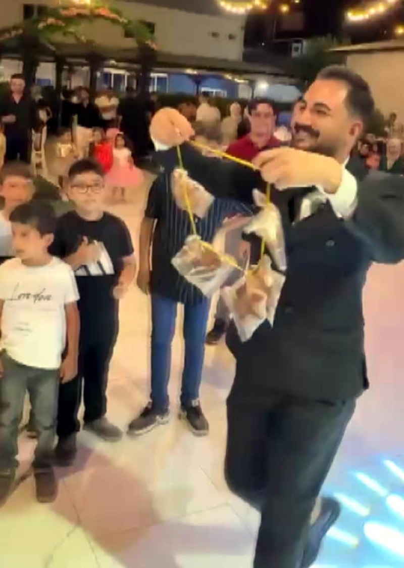 Düğünde düzenlenen takı töreninde, davetliler gelin ve damada para ve altın takarken, en ilginç takı ise damadın kebapçı olan ağabeyi Doğan Gündeş’ten geldi.