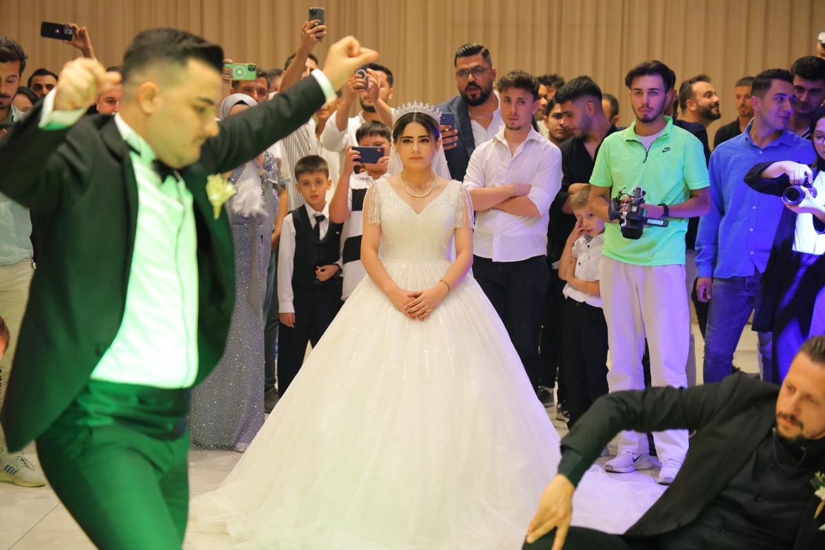 Aile bireylerinin ilgi gösterdiği düğün gecesinde çiçeği burnunda çift alkışlarla salona girdi. Sahnede dans yapıp zeybek gösterisini de izleyen çift, daha sonra tebrikleri kabul etti.