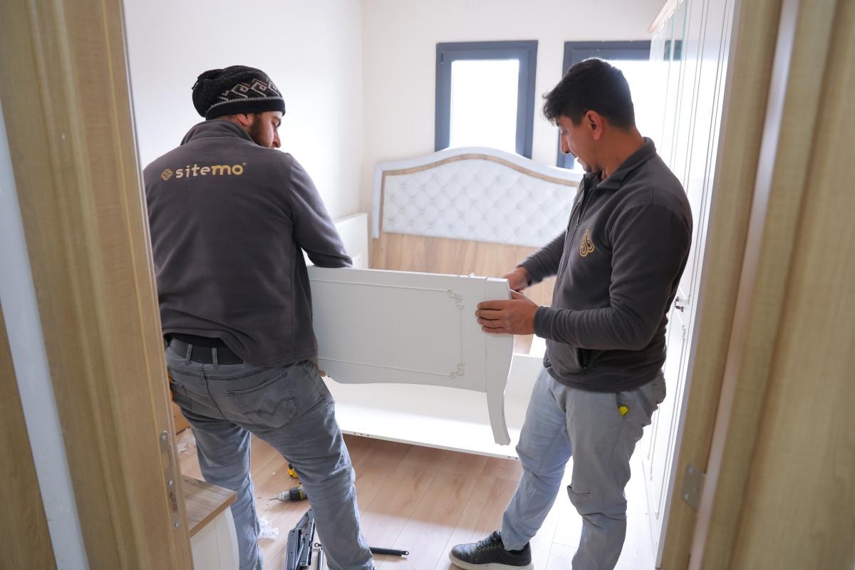 Yuvalarına kavuşan depremzedeler, bir yandan temizlik yaparken bir yandan da mobilyalarını yerleştiriyor.