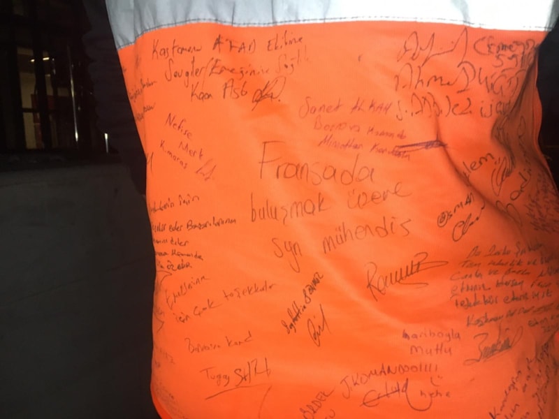 "Gerçekleştirmiş olduğumuz bu sorumluluk projesinde onlardan hatıra istedik. Oradaki insanlardan iyi dileklerini birkaç kelimeyle ifade edilmesini istedim. Onlardan hatıra olarak imza aldım. Depremzededen oradaki ekibe kadar bütün insanlardan hatıralar biriktirdik. Bu yeleği Kastamonu gönüllülük ofisine teslim edeceğim"