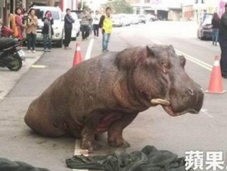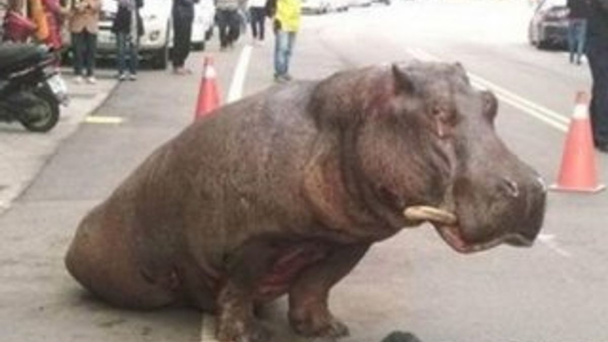 Miaoli kasabasında gerçekleşen olayda, şoför fren yapınca korktuğu belirtilen hipopotam, önce park halindeki bir aracın üstüne, oradan da yola düştü.
