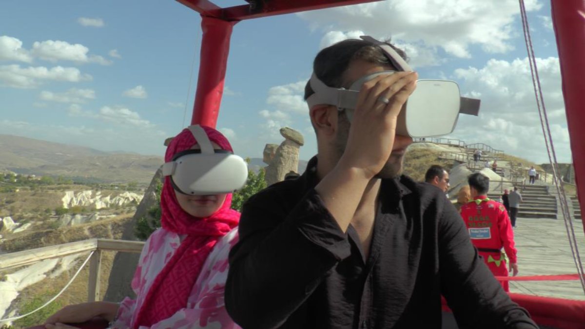 Nevşehir’in Ürgüp ilçesine bağlı Üçgüzeller mevkii'nde bulunan balon maketine binen yerli turistler, 3 boyutlu sanal gözlük yardımıyla Kapadokya Bölgesini kuş bakışı izleme imkanı buluyor.