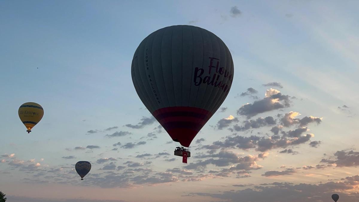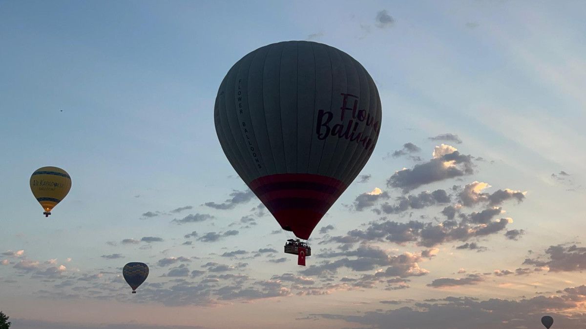 Kapadokya'da bazı sıcak hava balonlarının sepetine, 30 Ağustos Zafer Bayramı'nın 103'üncü yıl dönümü nedeniyle Türk bayrakları asıldı.