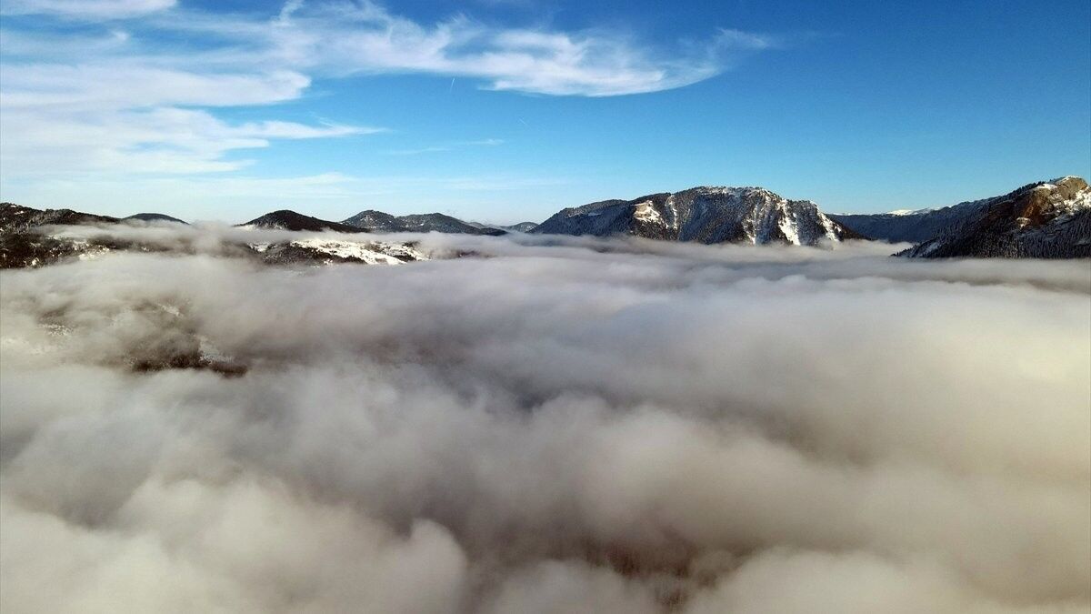 Dağın bazı bölgelerinde etkili olan sis ve karla ortaya çıkan manzara ziyaretçilerin ilgisini çekiyor.