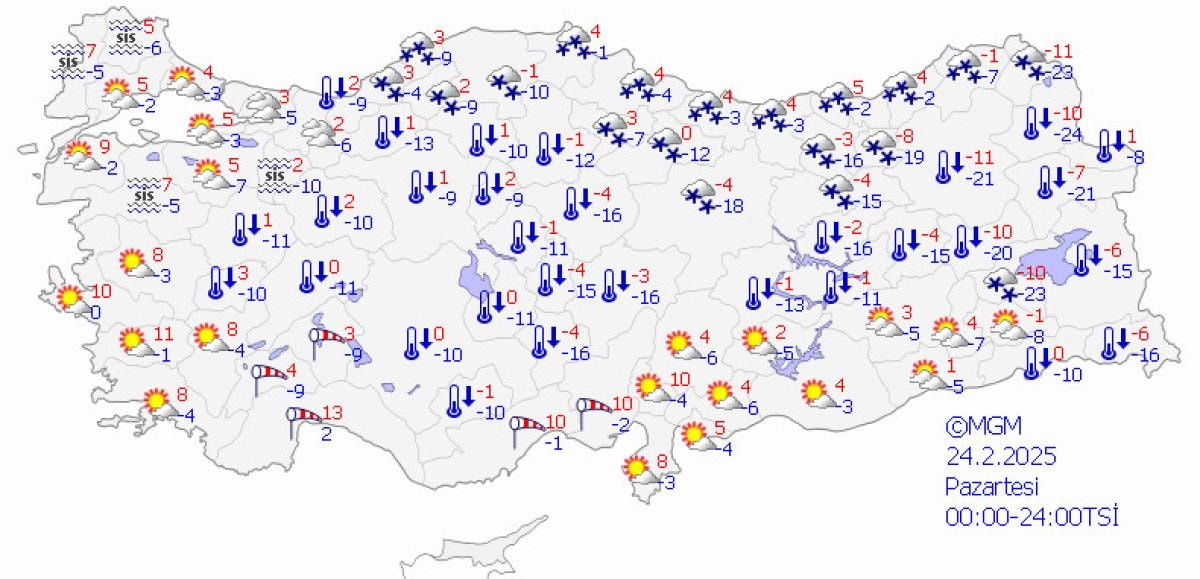 Çok bulutlu ve aralıklı kar yağışlı geçeceği tahmin ediliyor. Yağışların, kuzey kesimlerinde yer yer kuvvetli olması bekleniyor.