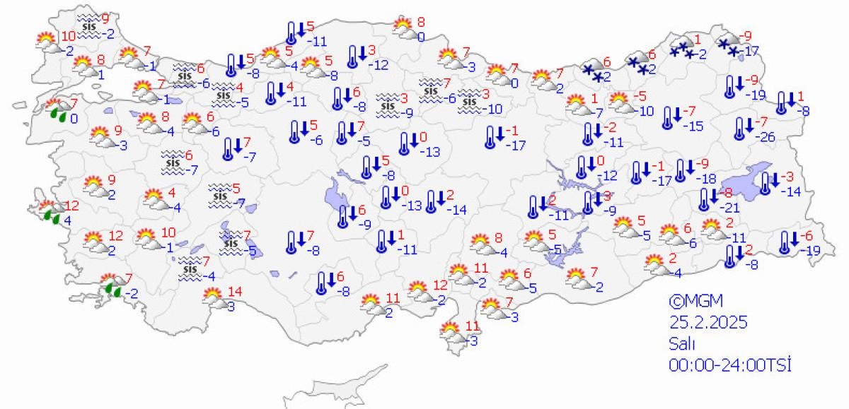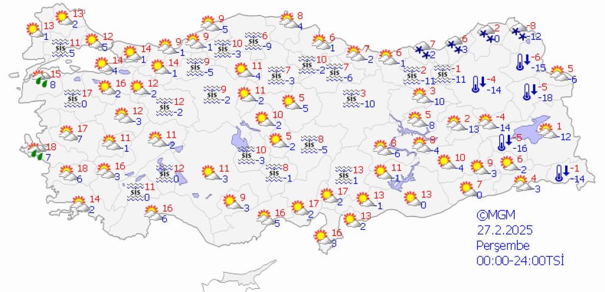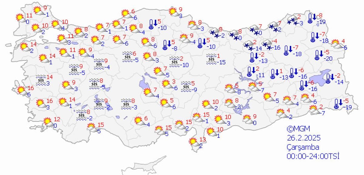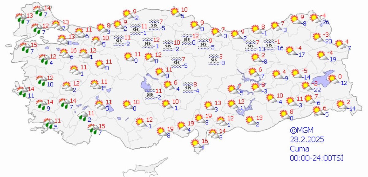 Meteoroloji Genel Müdürlüğü tarafından yapılan tahminlere göre; ülkemizin kuzey, iç ve doğu kesimlerinin parçalı ve çok bulutlu, Karadeniz (Düzce ve Bolu hariç) ile Erzincan, Ardahan ve Sivas çevreleri ile Kayseri’nin kuzey ve doğusu ve Yozgat'ın doğusunun kar yağışlı, diğer yerlerin az bulutlu geçeceği tahmin ediliyor.