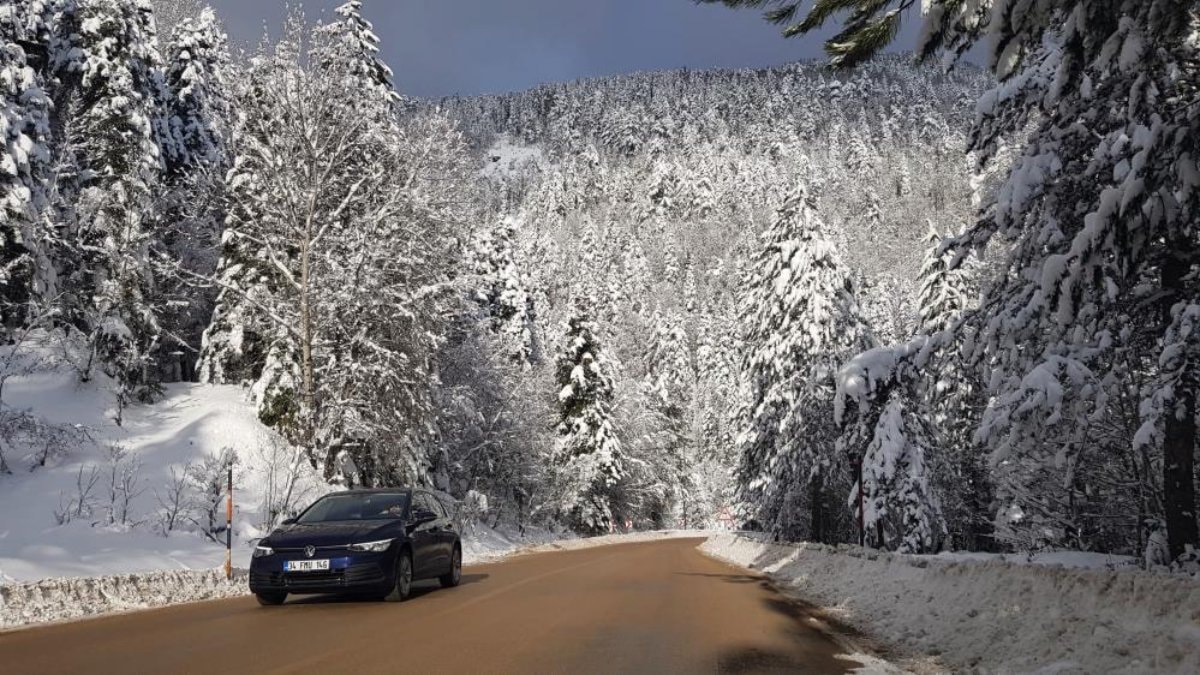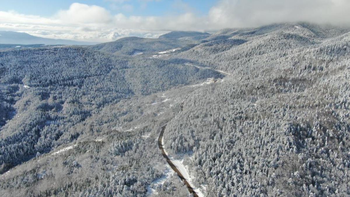 Karabük-Bartın kara yolu güzergahındaki ormanlar, yazın yeşil rengiyle büyülerken kar yağışının ardından beyaz örtüsüyle kartpostallık görüntüler ortaya çıkardı.