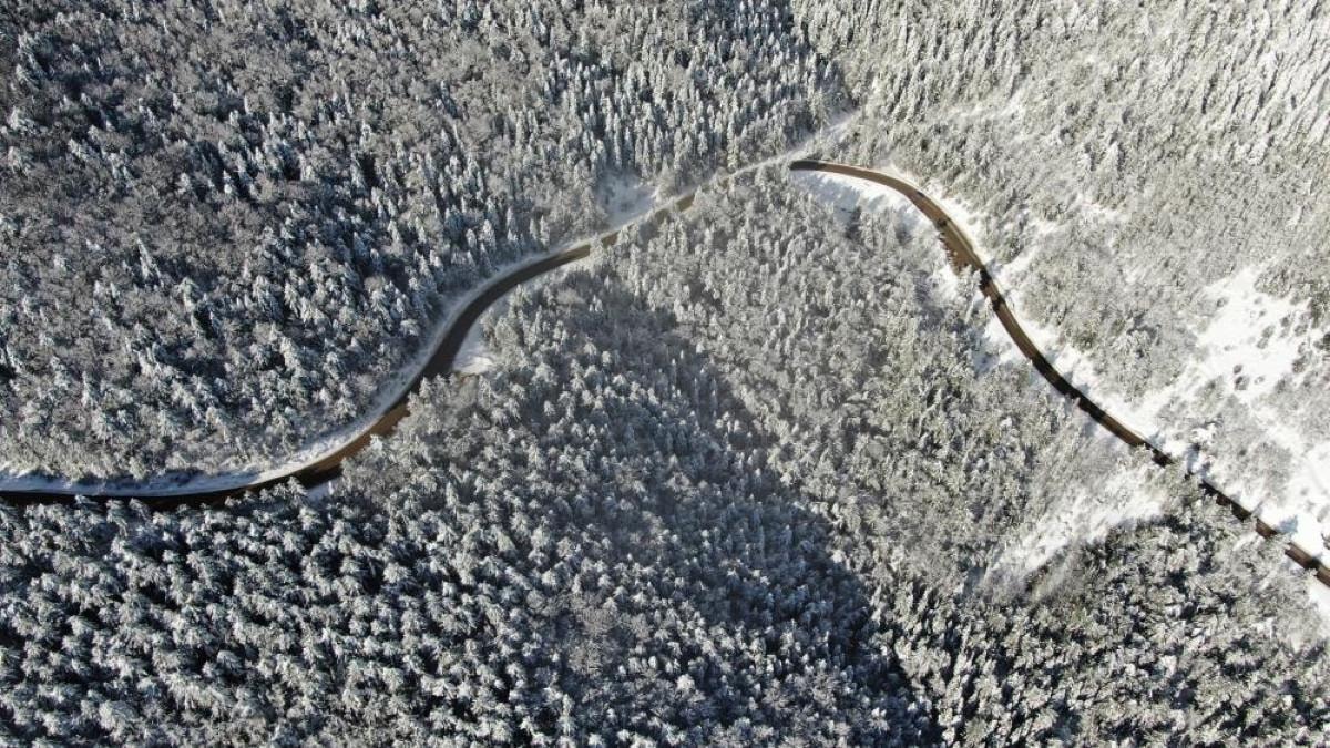 Beyaza bürünen orman ve kıvrımlı yollar drone ile görüntülendi.
