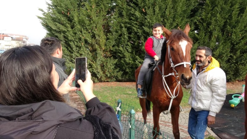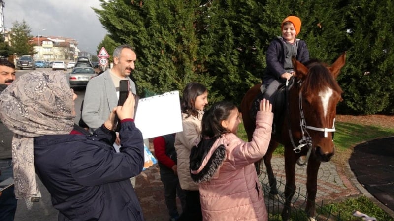 Bazı veliler, çocuklarıyla birlikte 'Umay' ve 'Aydeniz' isimli atlara ilgi göstererek başlarını okşayıp sevdi ve hatıra fotoğrafı çekildi.