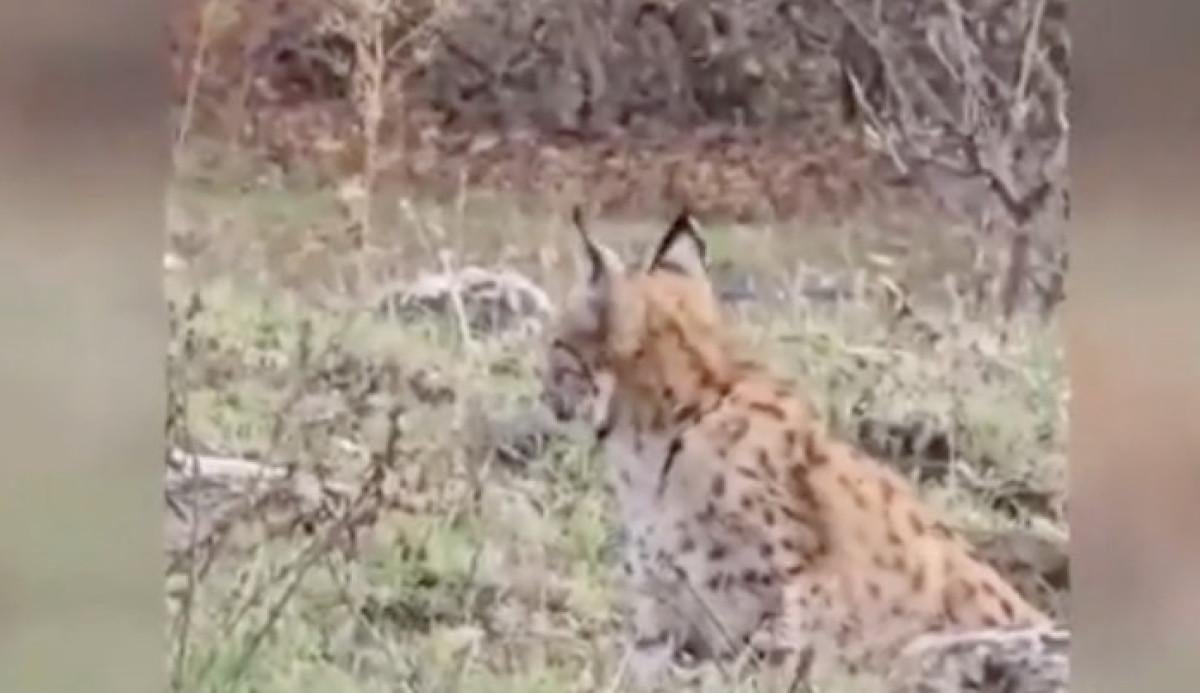 Görüntülerde, videoyu çeken kişilerin ormanlık alanda oturan vaşağa seslenmesi, hayvanın bir süre beklemesi ve ardından yürüyerek gözden kaybolması yer alıyor.