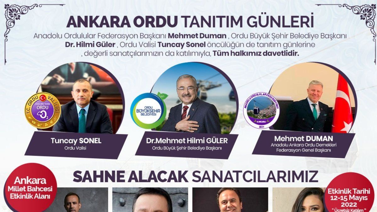 Karadeniz'in en sevilen şehri ve güzelliğiyle büyüleyen şehirlerinden Ordu için tanıtım günleri hazırlığı başladı. Anadolu Ordulular Federasyon Başkanı Mehmet Duman önderliğinde başlatılan proje Ordu Büyükşehir Belediye Başkanı Dr. Mehmet Hilmi Güler ve Ordu Valisi Tuncay Sonel önderlik yapıyor. Yeşilin ve Mavinin Başkenti Ordu tanıtım günleri 12-15 Mayıs tarihleri arasında Ankara Millet Bahçesi’nde gerçekleştirileceği duyuruldu. Tüm halk organizasyona davet edildi.