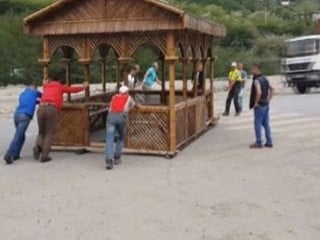Çayeli İlçesi Madenli Beldesi’nde, vidalı olduğu için sökülemeyen, zarar göreceği endişesiyle vinç yardımıyla da kaldırılamayan kamelya, kızağa dönüştürülen kalın plastik su borularının üzerine konuldu, kepçe yardımıyla çekilerek yeni yerine taşındı.