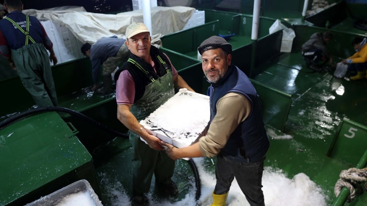 Balıkçı teknelerinde yoğun mesai yaşayan tayfalar, balık dolu kasaları limanda bekleyen kamyon ve tırlara yükledi.