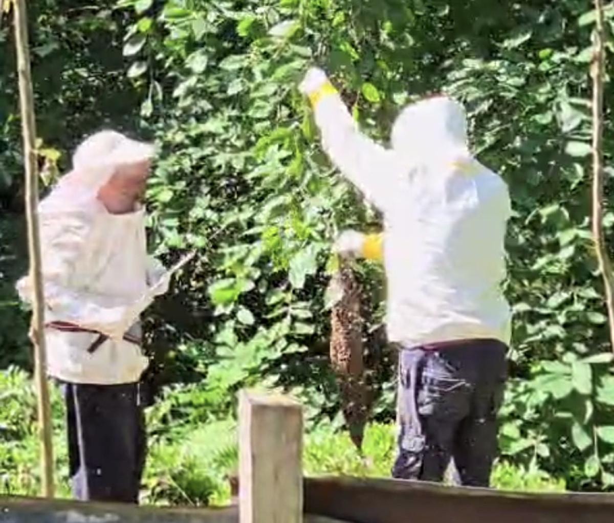 Özel kıyafetlerini giyen arıcılar, daldaki kraliçe ve beraberindeki binlerce arıyı boş bir kovana aktardı.