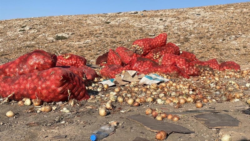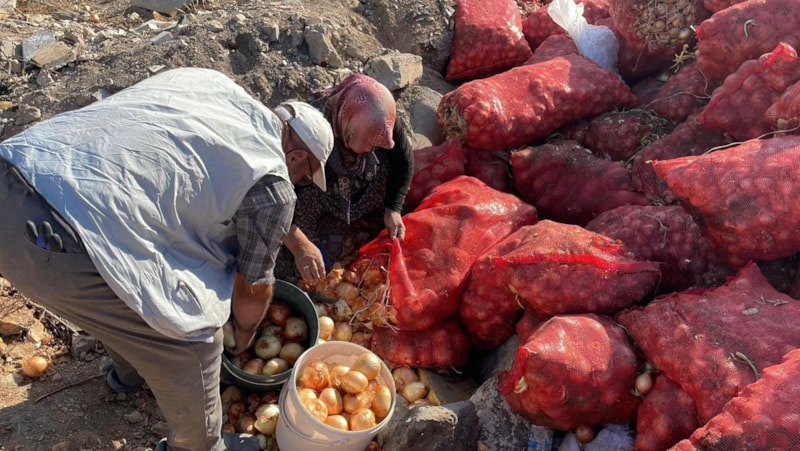 Taş ocakları mevkinde boş araziye tonlarca kuru soğan dökülmüş halde bulundu. Bazı vatandaşlar çuvallardan sağlam olan soğanları seçip topladı.