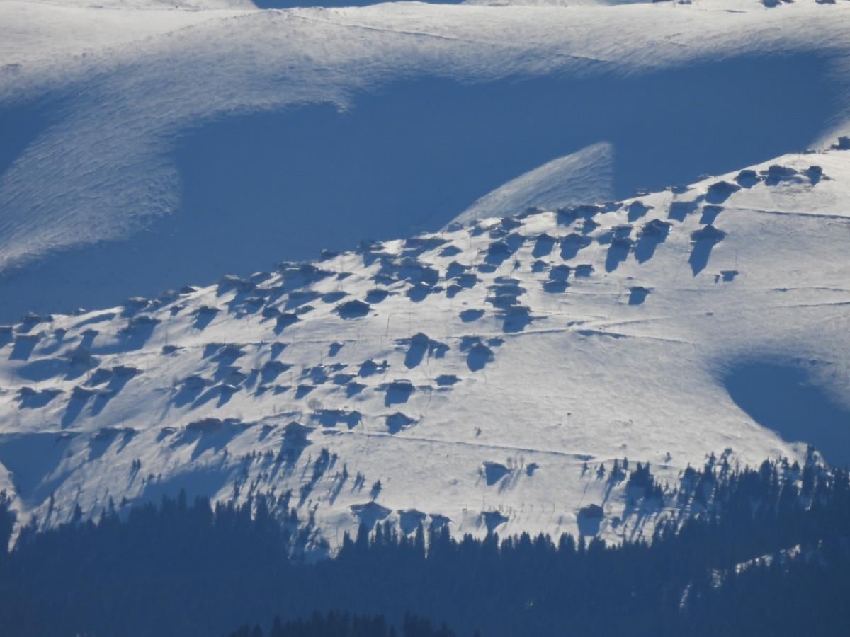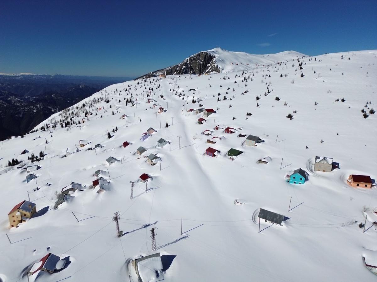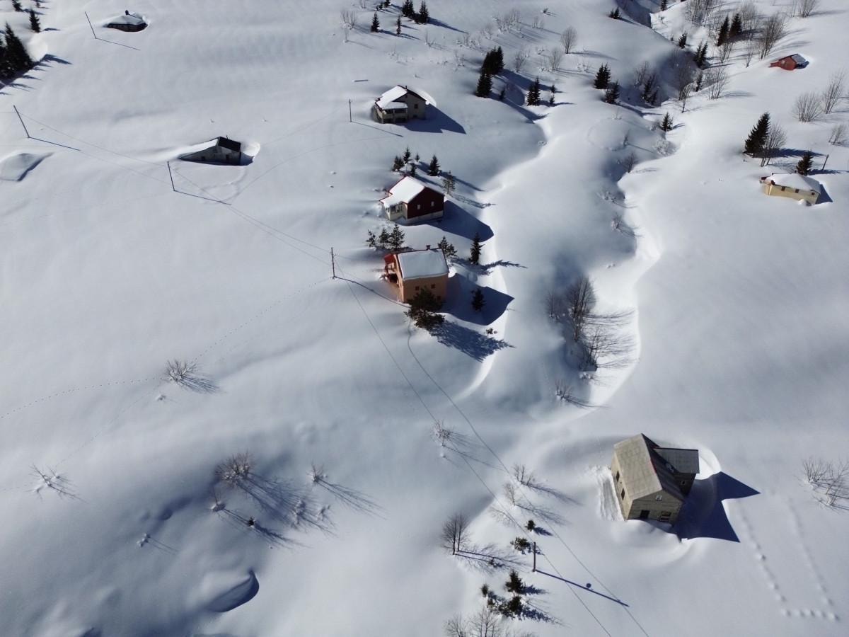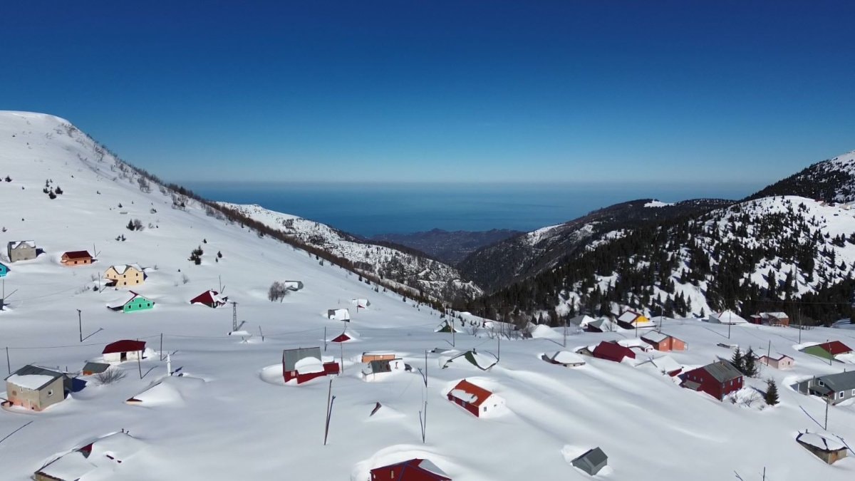 Karın evlerin boyuna ulaştığı yaylalarda ortaya çıkan görüntüler drone kamerasıyla görüntülendi. Güneşin etkisini göstermesiyle Sis Dağı zirvesinden görülen, yaklaşık 50 kilometre uzaklıktaki Karadeniz görsel şölen sundu.