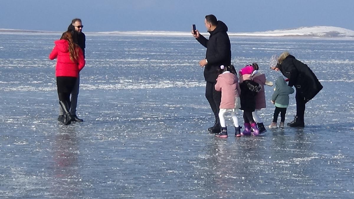 Ajanslarsa, turistlerin akın akın geldiği buz tutan gölün üzerinde eğlenenleri fotoğrafladı.
