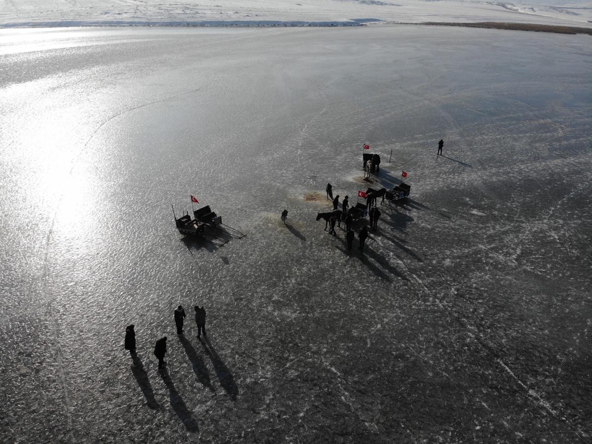 Cam gibi buz üzerinde dörtnala koşan atlar, kızaklarda bulunan vatandaşlar unutulmaz anlar yaşıyor.