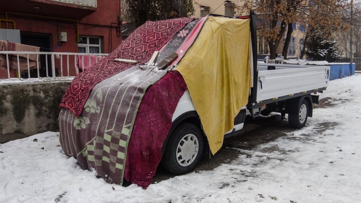 Vatandaşlar, araçlarını soğuk havaya karşı korumak için çareyi battaniyede buldu. Araçların üzeri battaniyelerle kaplandı.