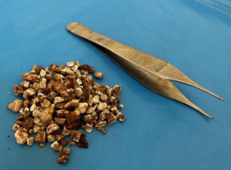Önce bir tarafı temizledik, çok zahmetli olacak diye esas büyük olanı sona bıraktık. Bir seansta bir tarafı temizledikten sonra araya bir süre koyduk, hasta iyileşti. İkinci seansta da 5 santimlik olan taş kısmını boşalttık. Tek tek taşları toplamak yaklaşık 4 saate yakın süren zorlu, çetin ameliyat oldu. Bu büyüklükte bir taş görüyorsak genellikle bu taşlar tek parça halinde olur. Biz onları kırarak küçültürüz. Boncuk tanesi gibi küçük yüzlerce taşı bir arada görmek bizim için de deneyim oldu.