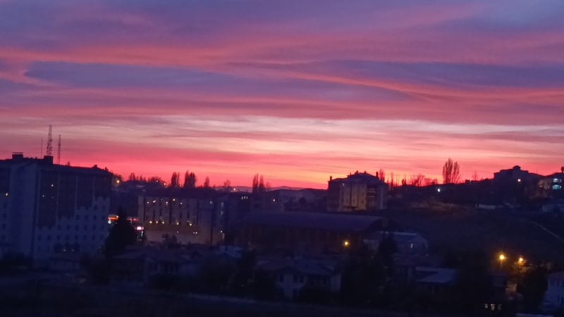 Kızıla bürünen bulutlar güneşin tam olarak batmasıyla birlikte kentin üzerinden çekildi.