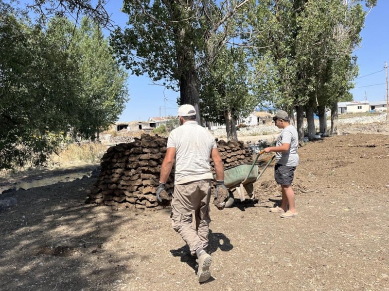Önce hayvan gübreleri toplanarak özel bir alanda biriktiriliyor. Ardından, içerisine saman ve su eklenerek ayaklarla çiğnenip yoğuruluyor. Hazırlanan bu harç, kalıplar halinde güneşte kurumaya bırakılıyor.
