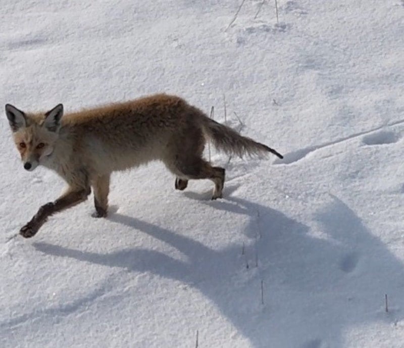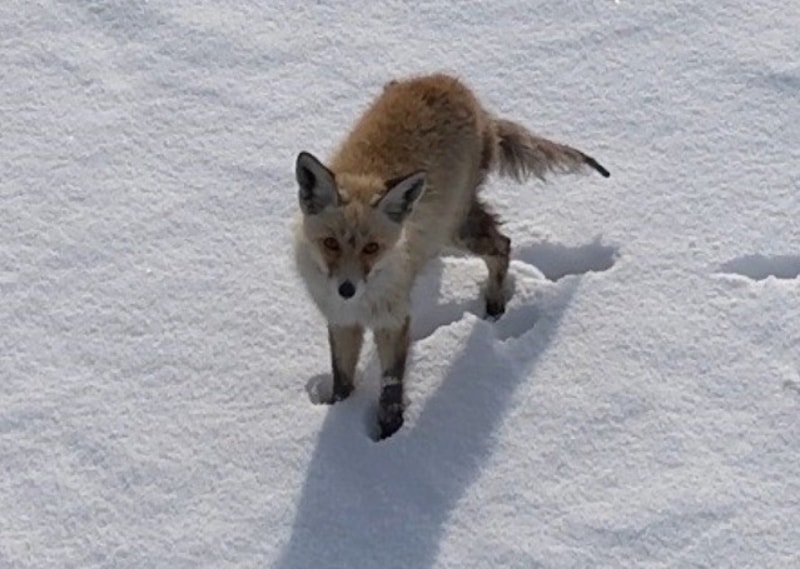 Karla kaplı arazide yiyecek arayan kızıl tilki, kendisini görüntüleyen drone'u fark edince önce merakla izledi, ardından hızla gözden kayboldu.