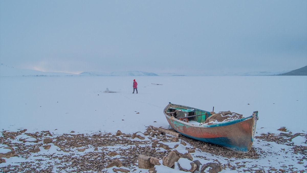 Soğuk havanın etkisiyle tamamen donan göl, karla kaplı dağlar arasında ziyaretçilerini büyüleyen güzelliyle ön plana çıkıyor.