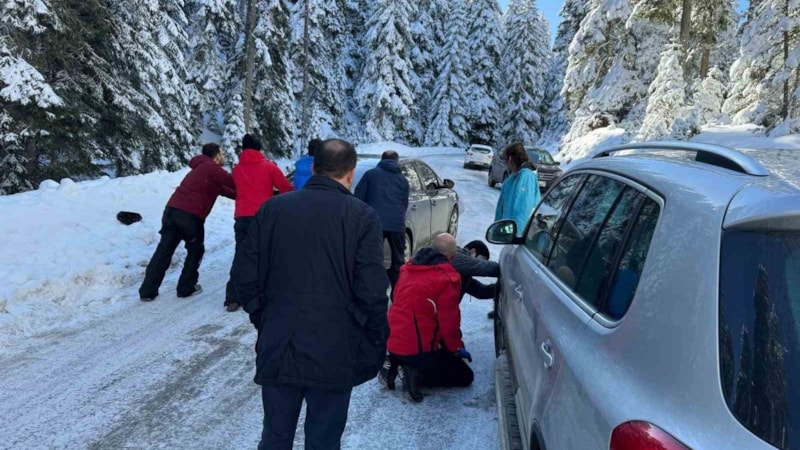 Bolu'nun Turizm merkezlerinden Kartalkaya Kayak Merkezi'ne tatile gitmek isteyen vatandaşların araçları kar ve buzlanan yolda kaldı.
