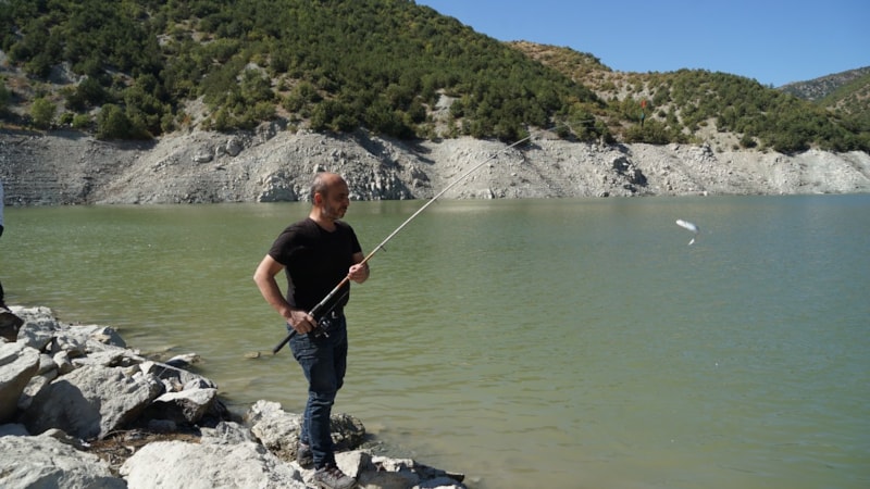 Balık tesislerindeki ağların patladığını söylüyorlar. Bizlerin de sonradan haberi oldu. İki gündür falan burada barajda balık tutuyoruz. Balığın tadı lezzetli, bir de balık tutmanın zevki de çok farklı. Bakın şu anda balık oltaya geldi, çekiyorum. Gelen alabalık. Alabalık tesisi var burada, ağlardan patlayınca sürekli alabalık geliyor oltaya.