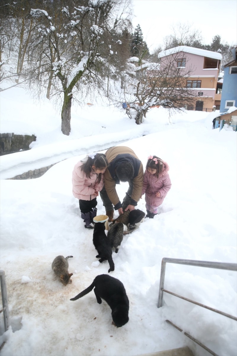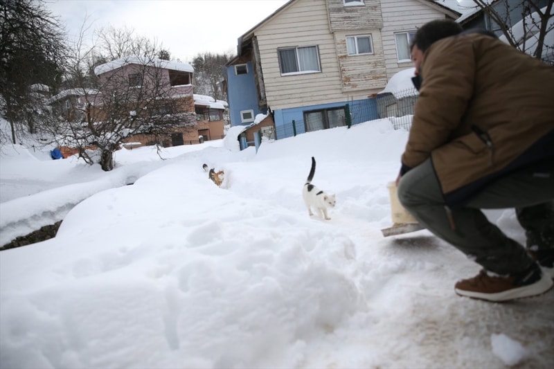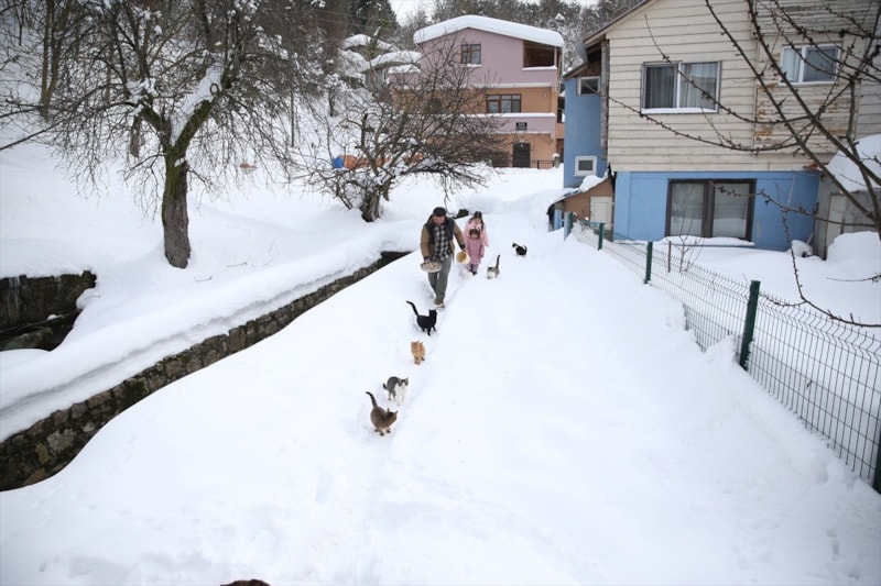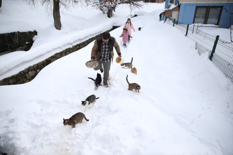 Kastamonu’nun Çatalzeytin ilçesine bağlı Yukarısökü köyünde etkili olan yoğun kar yağışı, sokak hayvanlarının yaşamını zorlaştırırken köy imamı Rıfat Şahin, her gün kedileri düzenli olarak besliyor.