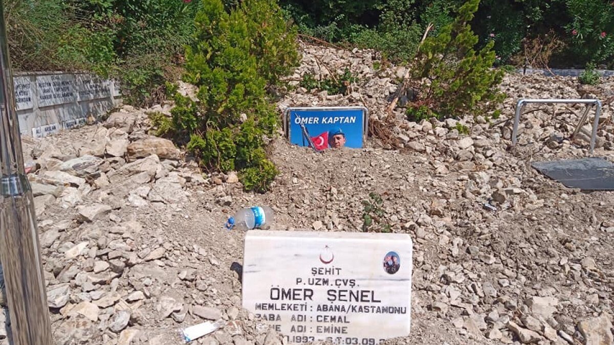 Komandolar, şehit askerin mezarını ve anıtı iş makinesi ile yapılan çalışmada elleriyle temizledi.